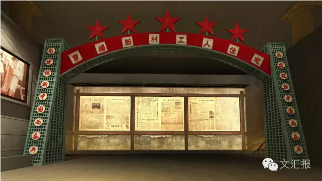 50年代街道圍墻制景、墻上排列著那個時候人們生活場景的照片,讓人們仿佛來到當年第一個工人新村——曹楊新村,在此駐足,正面的閱報欄將上演一場精彩的多媒體秀。