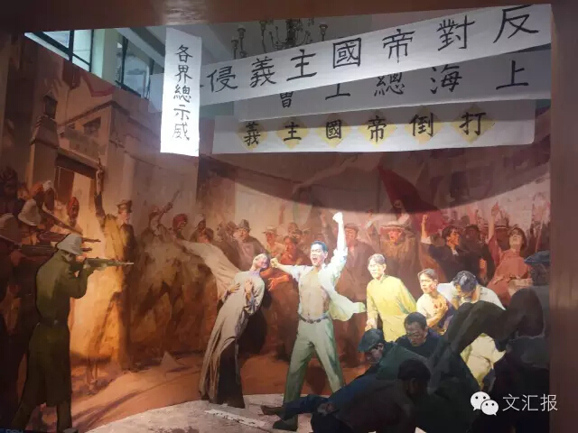 油畫框內展示五卅運動的立體油畫,冷暖色調的對比使其格外突出,震撼人心
