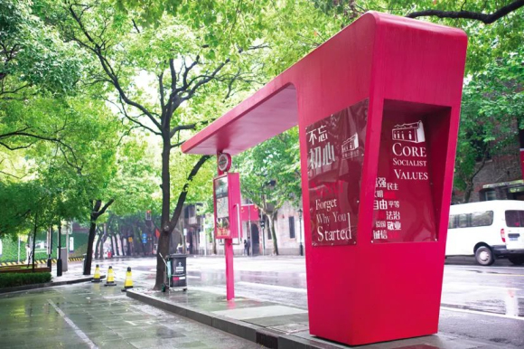上圖為2019年建成開放的中共中央政治局機關舊址內部陳列;下圖為2021年建成的紅色經典步道旁的“紅色候車亭”