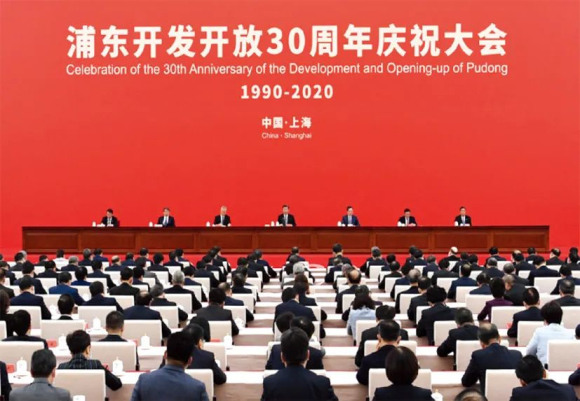 浦東全力貫徹落實《中共中央國務院關于支持浦東新區高水平改革開放打造社會主義現代化建設引領區的意見》和市《行動方案》,制定新區《實施方案》,大踏步邁上社會主義現代化建設引領區新征程,奮力書寫浦東開發開放新篇章。圖為2020年11月12日舉行的浦東開發開放30周年慶祝大會
