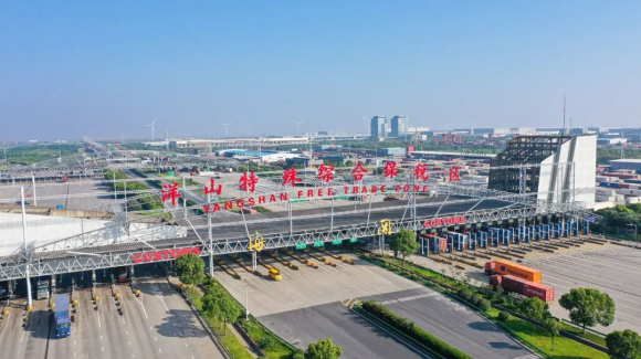 上海自貿區制度創新實現“四確立、四形成”,臨港新片區基本形成“五自由一便利”制度型開放體系,全面深化“放管服”改革。上圖為2021年1月20日實現全域封關驗收的全國唯一的特殊綜合保稅區——洋山特殊綜合保稅區;下圖為2019年7月31日,首批頒證企業代表在浦東新區“一業一證”改革發布會暨首批頒證儀式上合影