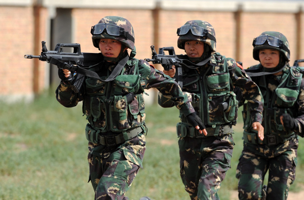 原陸軍第38集團軍某特戰旅女子特戰隊員在“和平使命—2014”聯合反恐軍事演習的前期分組訓練中進行實裝實兵訓練。