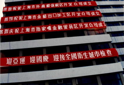 1990年9月10日,上海市陸家嘴金融貿(mào)易區(qū)、金橋出口加工區(qū)、外高橋保稅區(qū)開(kāi)發(fā)公司成立。圖為懸掛于由由飯店外墻的慶祝橫幅。新華社資料圖