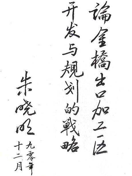 1990年12月,朱曉明撰寫的《論金橋出口加工區開發與規劃的戰略》封面原稿實樣。金橋開發區供圖