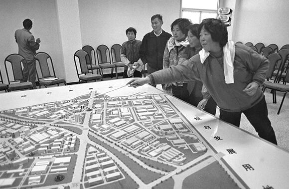 1993年1月,居民在看金橋出口加工區的規劃模型。新華社資料圖