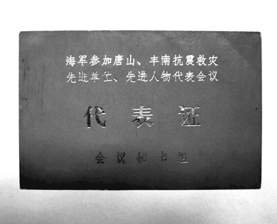 海軍參加“唐山、豐南抗震救災先進單位、先進人物代表會議”的代表證