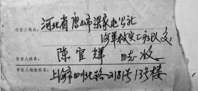 陳官輝在唐山期間,曾給上海醫院領導寫信匯報唐山情況,圖為領導回信的信封