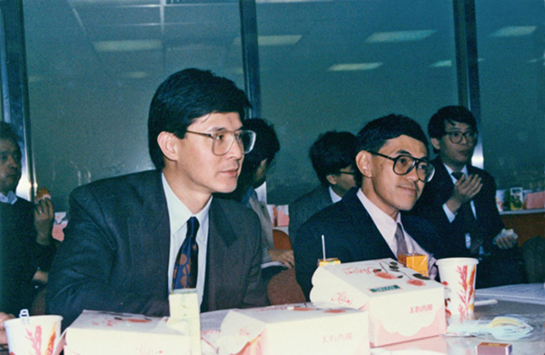 1988年12月,羅康瑞(左)與胡經(jīng)緯(右)在香港上海實(shí)業(yè)有限公司座談。