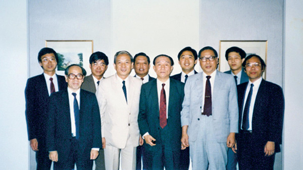 1988年6月,蔣如高(前排右二)、謝武元(前排左二)、周友琪(后排右二)、李鈺君(后排右一)赴香港進行政策宣傳與市場組織。圖為四人工作組在香港島中環環球大廈27樓與中銀集團成員合影。