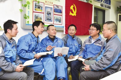 上海發電機廠制造部黨支部組織基層一線黨員開展集中學習教育。本報記者趙立榮攝